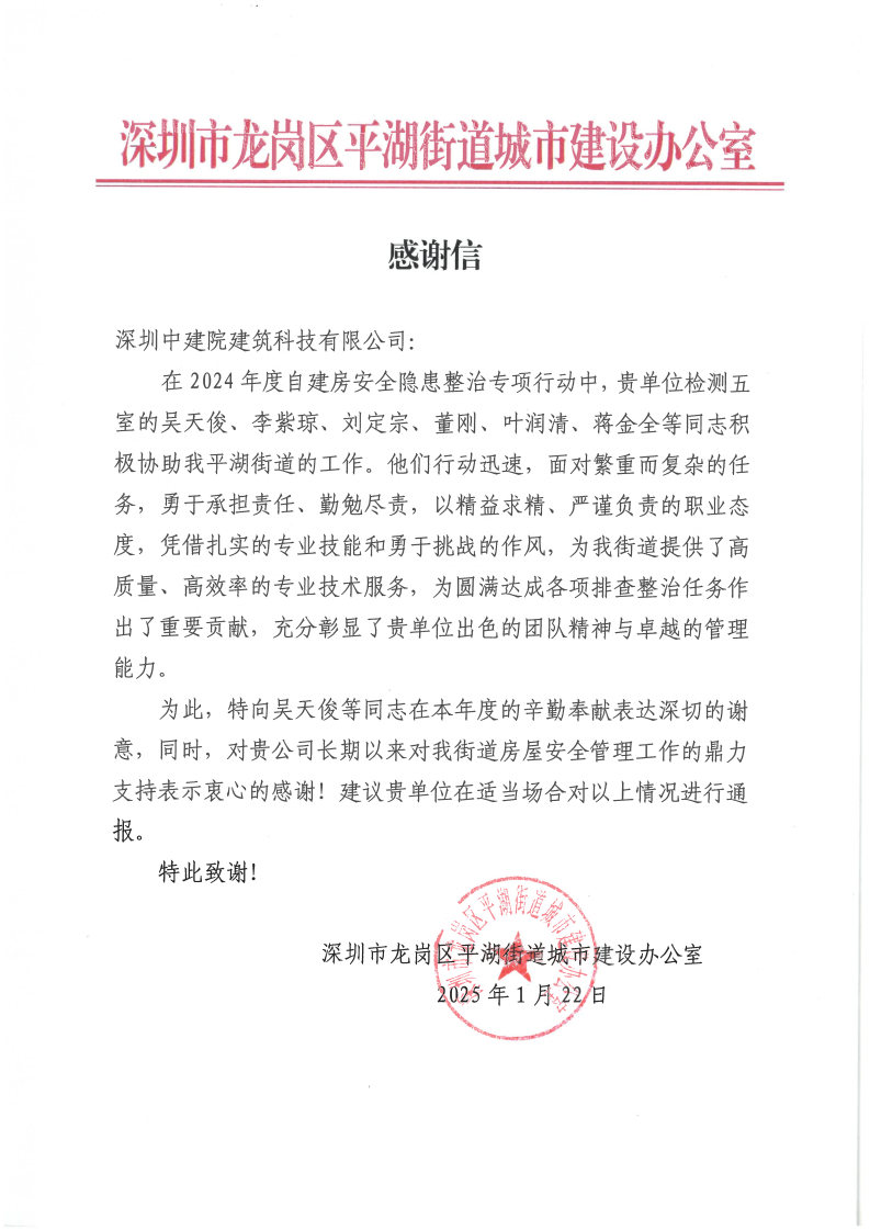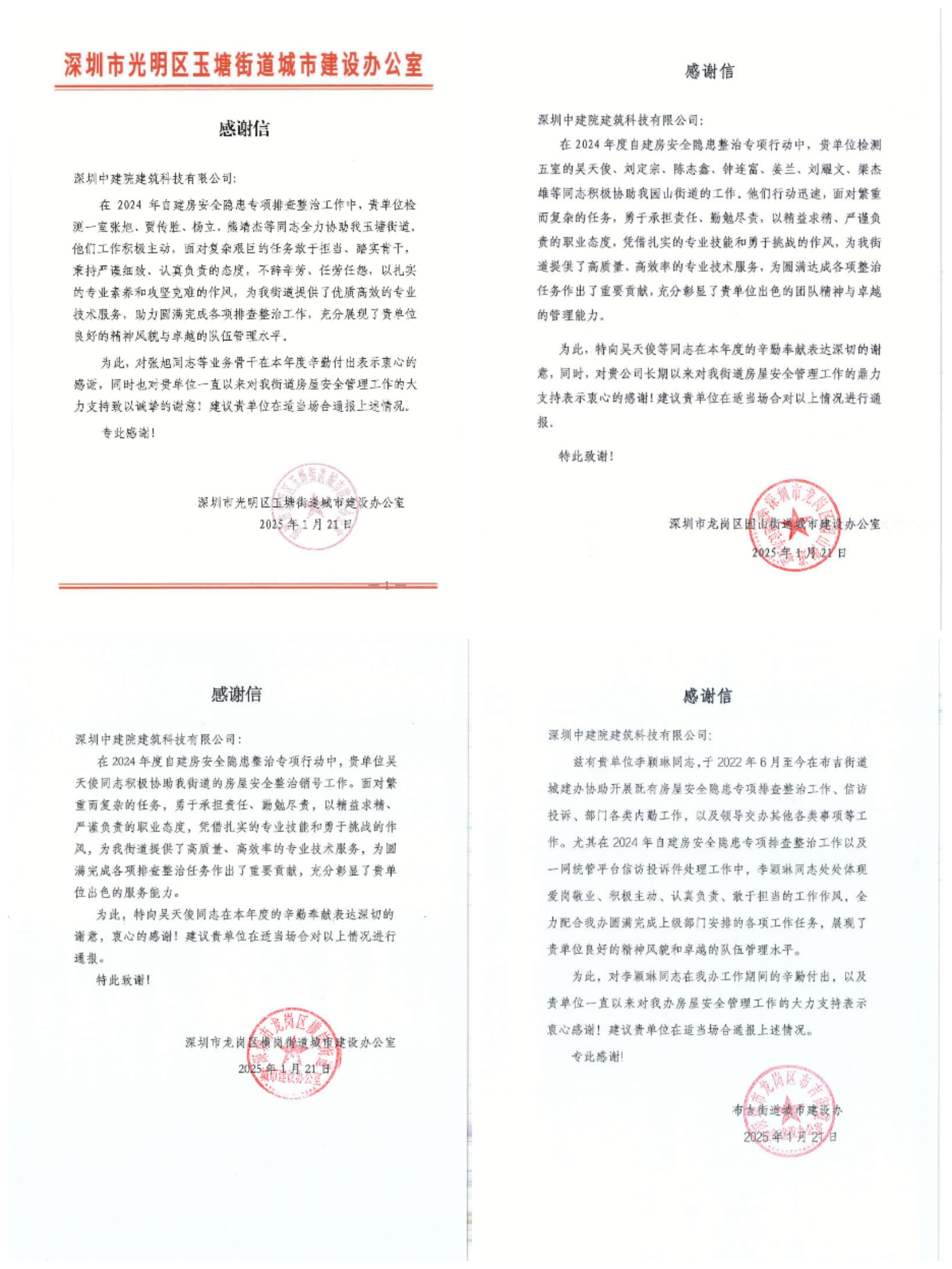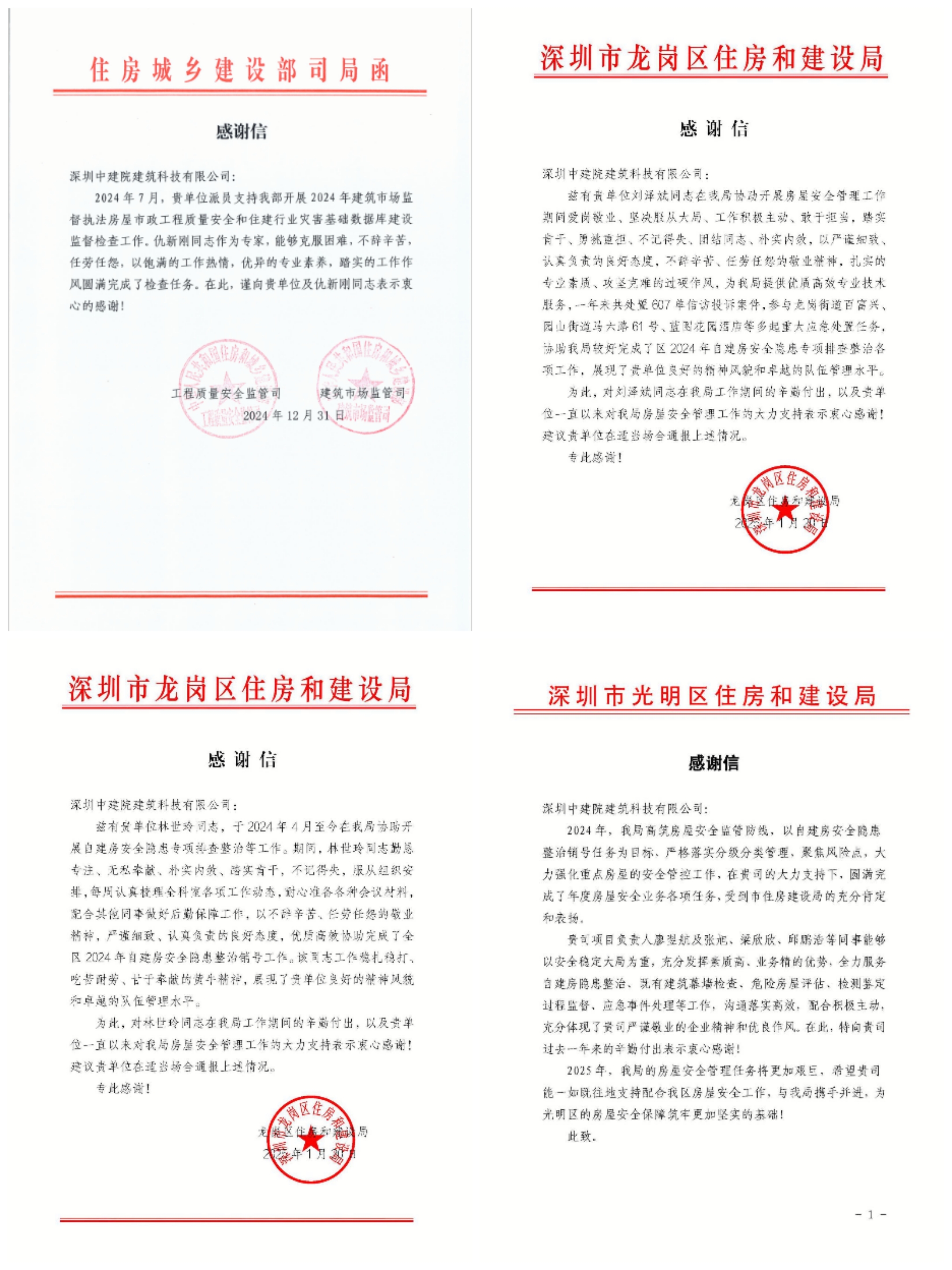 ?近日,中國(guó)建研院深圳分公司所屬深圳中建院陸續(xù)收到多封沉甸甸的感謝信——來(lái)自住房城鄉(xiāng)建設(shè)部工程質(zhì)量安全監(jiān)管司、建筑市場(chǎng)監(jiān)督司,深圳市光明區(qū)住房和建設(shè)局、龍崗區(qū)住房和建設(shè)局,及玉塘街道、園山街道、橫崗街道、布吉街道、平湖街道、新橋街道等政府部門。信中向深圳中建院在2024年建筑市場(chǎng)監(jiān)督執(zhí)法房屋市政工程質(zhì)量安全、住建行業(yè)災(zāi)害基礎(chǔ)數(shù)據(jù)庫(kù)建設(shè)監(jiān)督檢查工作中所作出的貢獻(xiàn),以及多年來(lái)對(duì)深圳市區(qū)住建部門、街道等轄區(qū)主管部門在房屋安全管理工作的默默付出表示感謝。